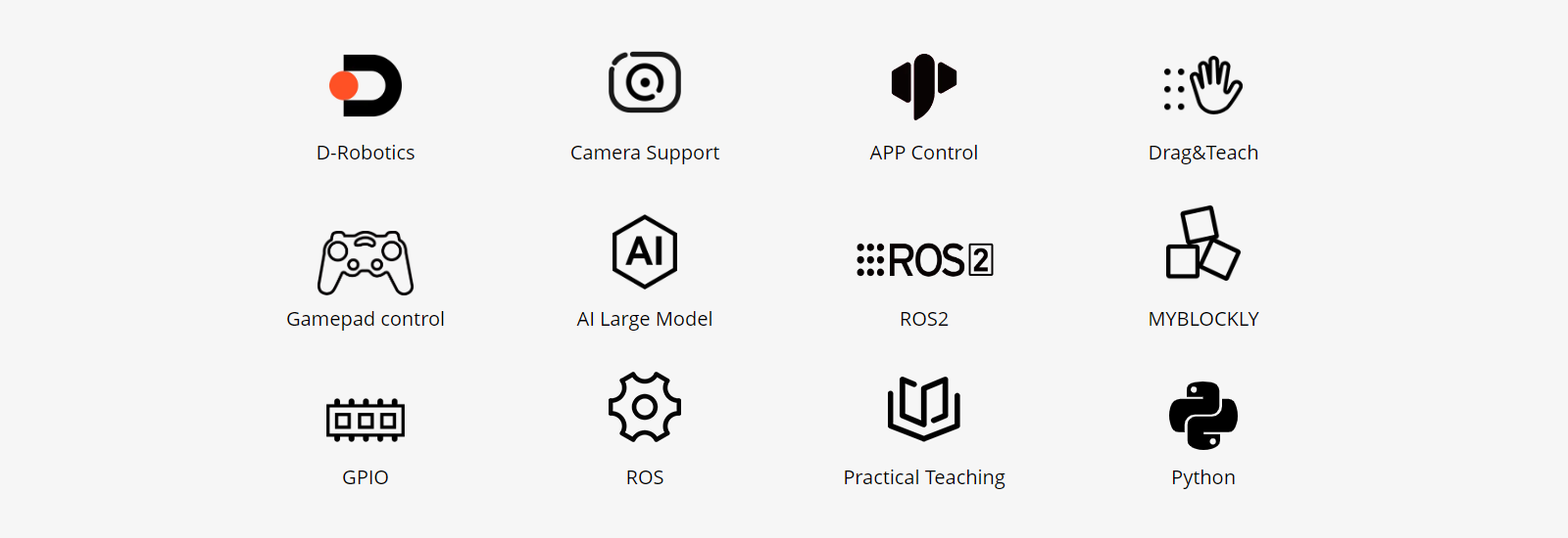 The RDK X5 boasts an outstanding community ecosystem, bringing together nearly 100,000 developers. It offers hundreds of accessories and kits, along with a wealth of content and events, helping developers solve problems and enhance their technical abilities. Serving as the control core, the myCobot 280 RDK X5 is specifically developed for scientific research, education, and innovative technology applications. It supports various control methods, including puzzle-style programming, code-based programming, and manual dragging. It comes with built-in motion control algorithms and offers over 90 open-source drive interfaces to aid in the development of complex applications. The integration of both ecosystems provides strong support for robot development, driving technological innovation and expanding applications.